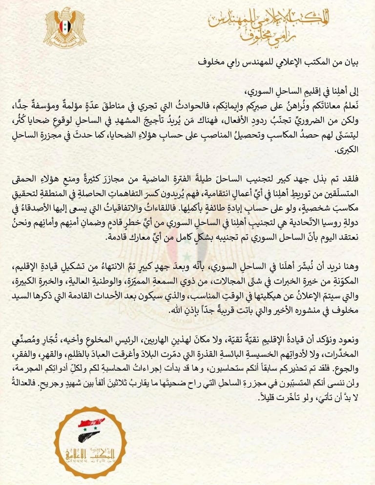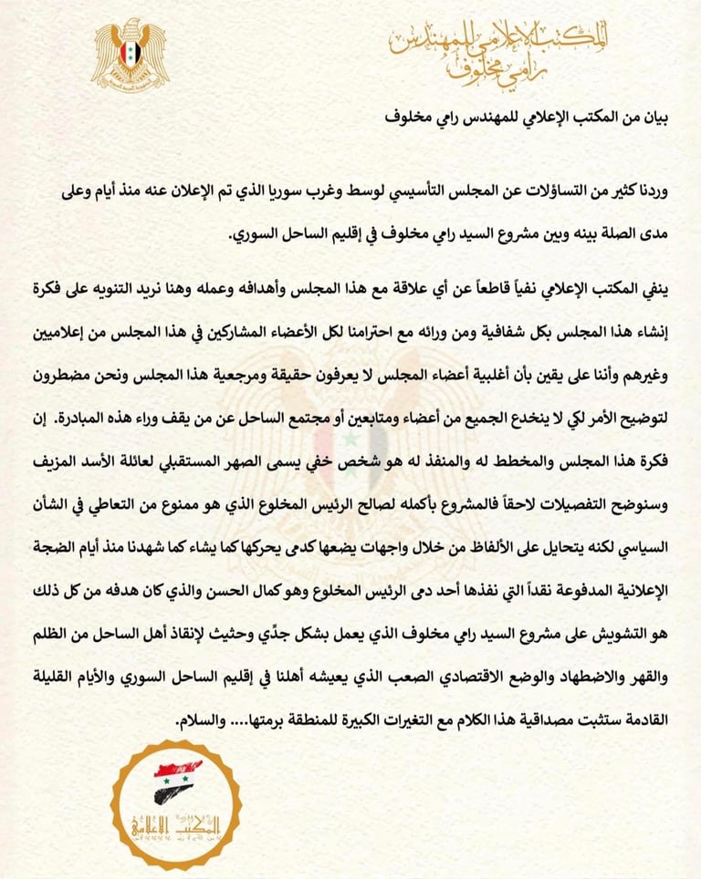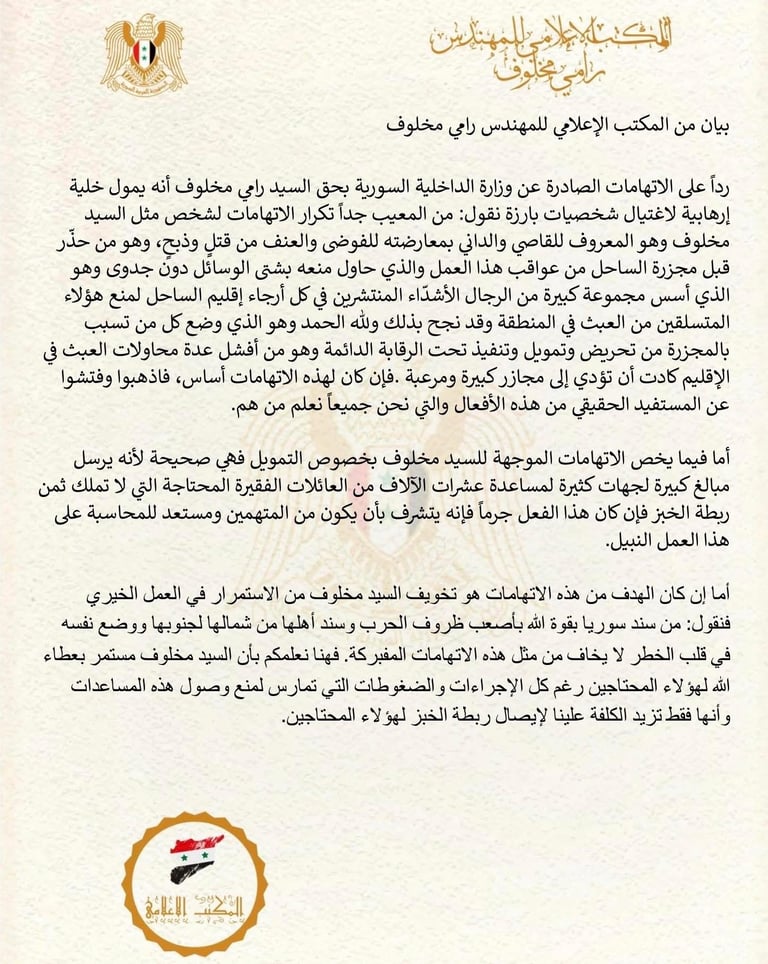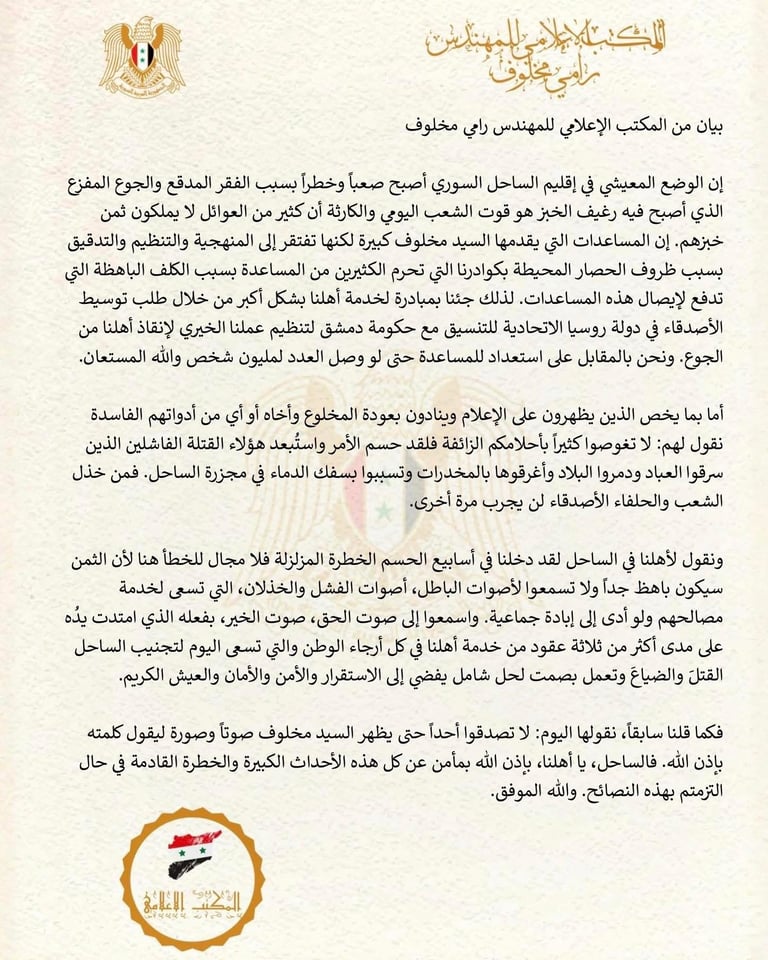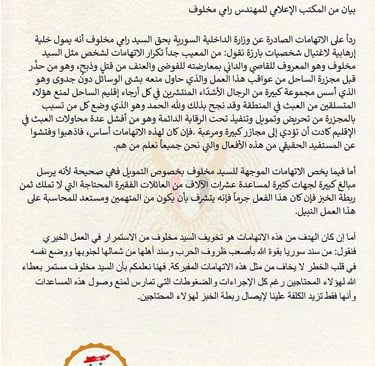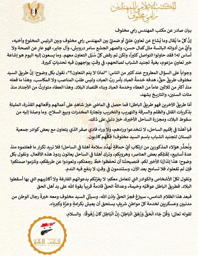بيانات المكتب الاعلامي للمهندس رامي مخلوف
